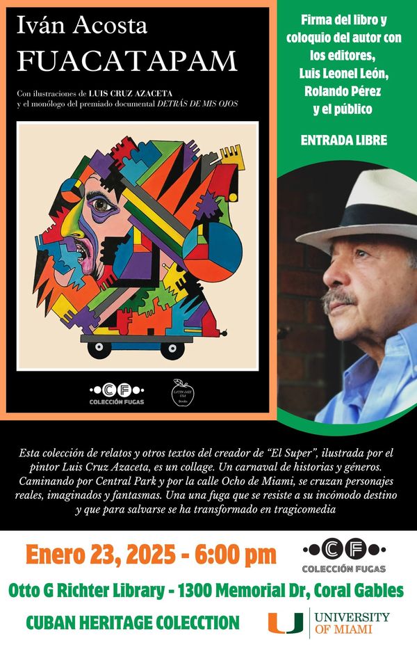 El destacado dramaturgo, escritor y cineasta Iván Acosta, autor de la famosa obra El Super, ha lanzado su nuevo libro, Fuacatapam, editado por Colección Fugas e ilustrado por reconocido pintor cubanoamericano Luis Cruz Azaceta. El jueves 23 de enero, a las 6:00 pm, Acosta conversará con sus lectores y firmará el libro en una presentación especial, abierta al público, en la Colección Cubana (Cuban Heritage Collection) de la Universidad de Miami.